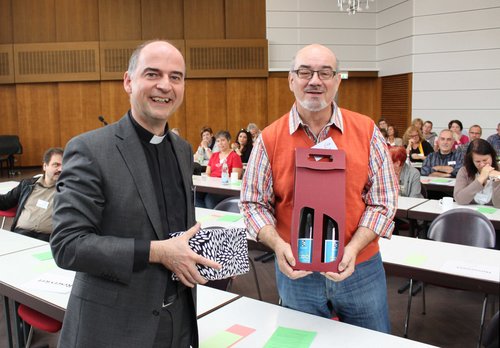 „Vorausschauend“, wie Wolfgang Schmidt ebenfalls war, habe er den Führungswechsel gut und langfristig eingeleitet. Und so konnte heute auch die neue DiAG-Vorsitzende Sabine Eichhorn-Krämer die DiAG-Sitzung leiten. „Seht ich mache alles neu“ – diesen Wahlspruch des Bistumsjubiläums nutzte Generalvikar Jung auch für die Geschenkübergabe an Wolfgang Schmidt: Er trete nun eine neue Welt ein, müsse sich neu sortieren – und dabei könne Wein aus dem Domnapf mit den dazu gehörenden Gläsern sicher helfen.