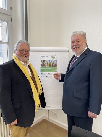 Alfried Wieczorek (links) und Kurt Beck freuen sich über den nahen Auftakt der Aktion „Die Pfalz wandert für den Dom“ © Foto: Europäische Stiftung Kaiserdom zu Speyer.