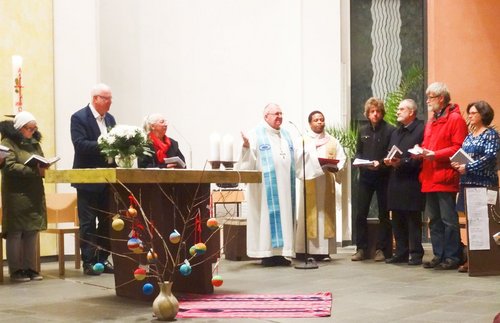Diese Spiritualität machte auch den Kern des Beauftragungsgottesdienstes am Abend des 22. Novembers in der Neustadter St.-Bernhard-Kirche aus. Sehr ungewöhnlich für eine heilige Messe war, dass sich nach der Lesung des Jona-Textes vier Gruppen zum Bibel-Teilen zusammensetzten: jeweils zwei Gruppen mit den Kursmitgliedern im Altarraum sowie zwei Gesprächsgruppen in den Kirchenbänken. Beim Punkt „Handeln – sich senden lassen“ äußerte sich eine Gottesdienstbesucherin: „Die 40 Tage in der Jona-Geschichte müssen wir in unseren jetzigen Zeitrahmen übersetzen. Vieles ist doch bereits heute zerstört, uns bleibt kaum noch Zeit zum Handeln.“ Eine solche Aussage erhält seine besondere Aktualität vor dem Hintergrund, dass am selben Tage Klimaexperten der UNO veröffentlichten: „Das letzte Mal, dass die Erde eine vergleichbare CO2- Konzentration erlebt hat, ist drei bis fünf Millionen Jahre her.“