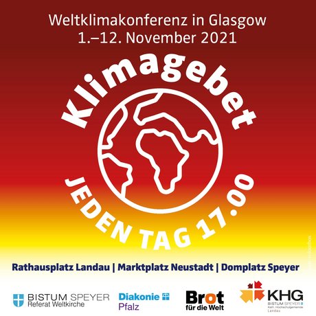 Landau/Neustadt/Speyer. Am 31. Oktober beginnt die nächste Weltklimakonferenz in Glasgow. Aus diesem Anlass lädt der ökumenische Arbeitskreis Globale Verantwortung des Bistums Speyer und des diakonischen Werkes der Pfalz vom 1. bis 12. November zu einem täglichen Klimagebet ein. Von 17 bis 17.30 Uhr wird im Konferenzzeitraum auf dem Rathausplatz in Landau, dem Marktplatz in Neustadt und dem Domplatz in Speyer jeweils ein etwa 20 bis 25 Minuten dauerndes Gebet mit Impulsen, Austausch und gemeinsamem Schweigen stattfinden. Die Initiator:innen möchten mit ihrer Aktion auf die Verhandlungen in der schottischen Stadt aufmerksam machen und dazu motivieren, Position für den Klimaschutz zu beziehen. Material und Anregungen zu dem Klimagebet stehen auf der Seite der katholischen Hochschulgemeinde Landau www.khg-landau.de als Download bereit.