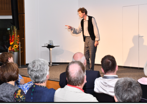 Für Dr. Wolfgang Heer, Vorstand der Heinrich-Pesch-Stiftung geht es beim Erzählen darum, Geschichten und Märchen zu erhalten sowie Werte zu vermitteln. „Mit 148 Zeichen auf Twitter kann man keine Geschichten erzählen“, sagte er. Heers Dank galt dem Team des Erzählfests und der BASF SE, die das Erzählfest finanziell unterstützt. Auch die Heinrich-Pesch-Stiftung leistet einen Beitrag. Diese Unterstützung ermöglicht, dass die Tradition des Erzählens aufrecht erhalten wird.„Geschichtenerzähler sind Traumtänzer. Wir glauben an die Phantasie“, sagte Susanne Tiggemann, die zusammen mit Selma Scheele die künstlerische Leitung des Internationalen Erzählfests innehat. Dass Geschichtenerzähler nicht nur Traumtänzer, sondern auch Querdenker sind, bewiesen dann Betsy Dentzer, André Wülfing und Susanne Tiggemann. Da war etwa die Geschichte von Onkel Gerd, der unbedingt beweisen wollte, dass die Welt rund ist. Dafür machte er sich auf den Weg, immer geradeaus der Nase nach. Nach umfangreichen Planungen kletterte er auf einer Leiter über das Nachbarhaus: „Tante Ingrid hat ihn nie wieder gesehen – ich auch nicht“, sagte André Wülfing. Susanne Tiggemann zog die Besucher mit ihrer Geschichte aus Japan in den Bann: Einem alten Mann wächst ein Apfelbaum auf dem Kopf, dann Pilze, später tummeln sich Kois in einem Teich auf seinem Kopf. Er verkauft die Produkte auf dem Markt und erweckt damit den Neid anderer Bauer. Erst als er die Reissamen, die inzwischen auf seinem Schädel sprießen, verschenkt, wird der Alte glücklich. Mit handfesten Beziehungstipps warteten Betsy Dentzer und André Wülfing auf. In ihrer Geschichte erfuhren die Zuhörenden, wie sich “ Streit vermeiden lässt. Ganz einfach – mit einem Mund voller Wasser lässt es sich schlecht sprechen und besser nachdenken. Der Musiker Thomas Gruber begleitete den Eröffnungsabend mit ungewohnten Klängen: Er spielte auf dem Hackbrett.