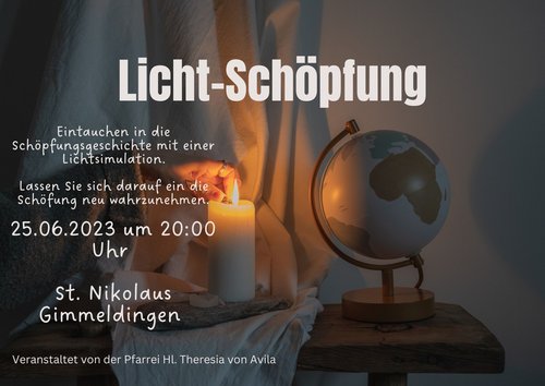 Gimmeldingen. "Licht-Schöpfung" - unter diesem Namen lädt die Pfarrei Hl. Theresia von Avila alle Interessierten am 25. Juni um 20 Uhr in die St. Nikolaus Kirche in Gimmeldingen ein. Die Teilnehmerinnen und Teilnehmer können in der etwa 30 Minuten dauernden Andacht die Schöpfungsgeschichte ganz neu "für sich gewinnen". Damit der Text aus Genesis 1,1 seine ganze Kraft entfalten kann, wird die ganze Kirche mit vielen Scheinwerfern und Soundeffekten erfüllt.