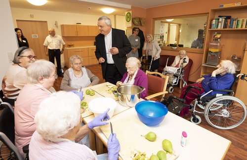 Bischof Wiesemann feierte mit der Pfarrei Gottesdienste in den Kirchen St. Rochus und St. Maria, führte Gespräche mit den hauptamtlichen Mitarbeiterinnen und Mitarbeitern, den Vorsitzenden des Pfarreirats, der Gemeindeausschüsse und des Verwaltungsrats und traf sich mit den Leitungen der Kindertagesstätten der Pfarrei in der Kindertagesstätte St. Konrad. Ein Begegnungsabend der Gemeindeausschüsse gehörte ebenso zum Besuchsprogramm wie ein Treffen mit allen Mitgliedern des Pfarreirats und des Verwaltungsrats sowie ein Besuch des Caritas-Altenzentrums St. Hedwig. Hier sind Seelsorge und Caritas auf einzigartige Weise miteinander verbunden: Die 2007 neu errichtete Kirche Heilig Kreuz ist als Hauskapelle baulicher Bestandteil des Caritas-Altenzentrums St. Hedwig. Die Pfarrgemeinde feiert ihre Gottesdienste, Andachten, Gebetszeiten und kirchlichen Feste im Altenzentrum. Die Bewohnerinnen und Bewohner haben so die Möglichkeit, am normalen kirchlichen Leben Anteil zu nehmen. „Sie haben ihren Platz mitten in der Gemeinde“, erklärte Jutta Asal-von Wuthenau, die Leiterin des Hauses.