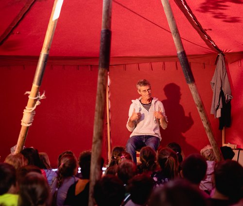 Geschichtenerzähler*innen aus aller Welt gehen mit ihren Zuhörern*innen auf Erzählwanderung, besuchen Kinder in Kitas und Grundschulen und schlagen ihr rotes Erzählzelt auf.