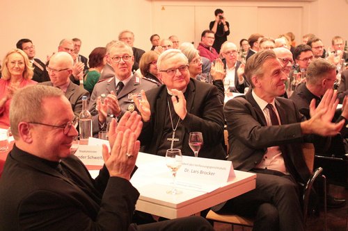 Aus den rheinland-pfälzischen Bistümern waren neben Bischof Kohlgraf und Erzbischof Woelki unter anderen der Bischof von Limburg, Georg Bätzing, der Trierer Bischof, Dr. Stephan Ackermann, und der Bischof von Speyer, Dr. Karl-Heinz Wiesemann, gekommen. Musikalisch gestaltet wurde der Abend von der Schulband „Feyer-Flies“ des Erzbischöflichen Clara-Fey-Gymnasiums in Bonn-Bad Godesberg unter Leitung von Dr. Markus Quabeck und Jakob Friese.