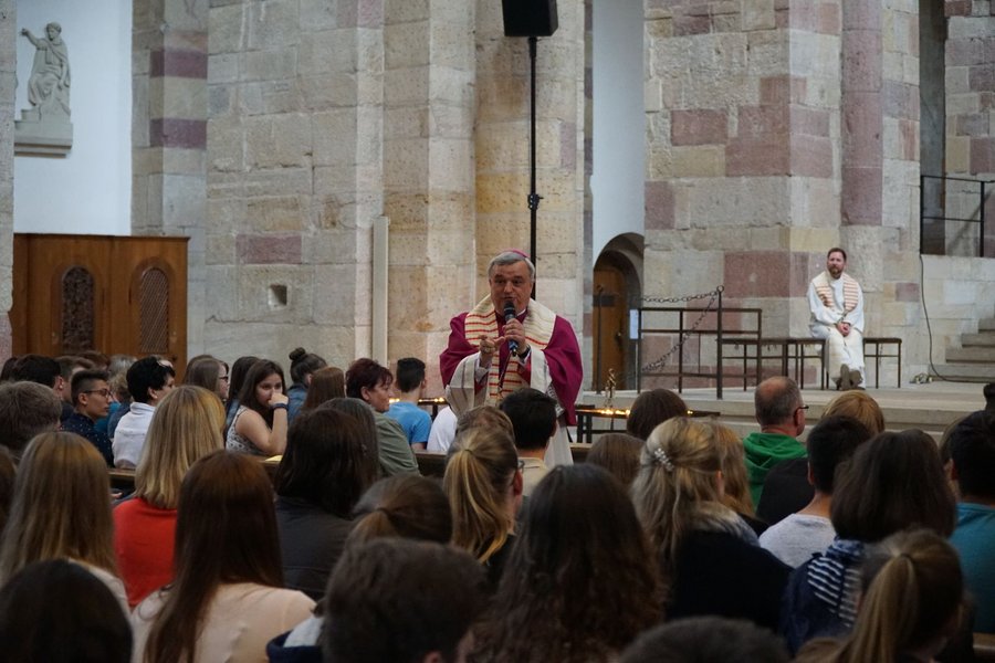 Den Abschluss des Tages bildete ein interaktiver Gottesdienst mit Bischof Wiesemann im Dom. Mit einer Kurznachricht wurden Sonnenanbeter rechtzeitig daran erinnert, den Eiscafé-Stuhl gegen die Kirchenbank einzutauschen. Auch im Gottesdienst war das Smartphone wichtiger Helfer: Die Teilnehmerinnen und Teilnehmern konnten per WhatsApp-Nachricht ihre Gedanken zum Glaubensbekenntnis auf die Großleinwand schicken. Dort wurden die Rückmeldungen für alle Mitfeiernden sichtbar gemacht. Für Paula (15) aus Ruppertsberg war der Gottesdienst dadurch besonders gelungen: "Mir hat der Austausch mit WhatsApp gut gefallen und dass unsere Antworten in den Gottesdienst eingeflossen sind." An verschiedenen Stationen im Kirchenraum fanden Lesungen statt.
