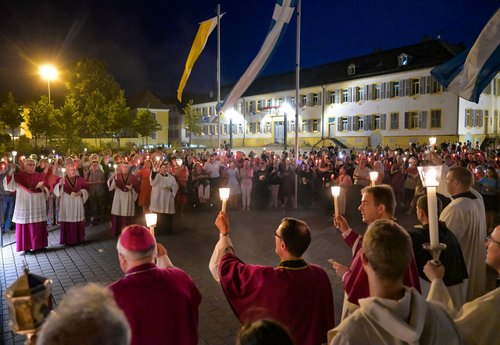 An die Marienfeier im Dom, die Dompfarrer Matthias Bender leitete, schloss sich die stimmungsvolle Lichterprozession durch den Domgarten an. Die musikalische Gestaltung hatten die Frauenschola Musica InSpira unter der Leitung von Monika Keggenhoff und die Dombläser übernommen. Den Schlusssegen nach der Prozession vor dem Dom spendete Bischof Dr. Karl-Heinz Wiesemann.