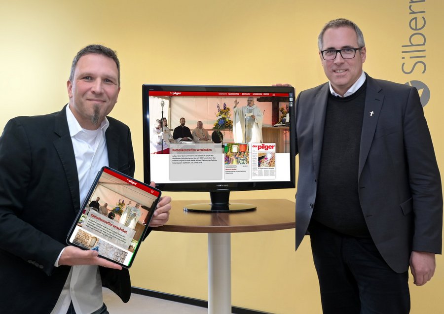 Gemeinsam mit Generalvikar Andreas Sturm (rechts im Bild), der auch der Herausgeber der Kirchenzeitung und des Magazins „der pilger“ ist, präsentierte Peregrinus-Geschäftsführer Marco Fraleoni die neue Plattform.