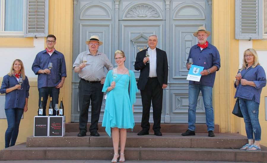 „Der Jahrgang 2019 war geprägt durch einen heißen und zweiten trockenen Sommer in Folge. Hatten die Reben in den Vorjahren die Trockenheit durch ihre tiefe Wurzeln noch besser verkraftet als angenommen, ging im Herbst 2019 der Ertrag im Vergleich zum Vorjahr stark zurück“, erklärte der Kirrweilerer Bürgermeister Rolf Metzger. Er übergab gemeinsam mit der stellvertretenden Beigeordneten Doris Janz, Weinprinzessin Marlen I. sowie Christian und Andrea Hartmann vom Weingut Hartmann, den Weinzehnt. Der zehnte Teil der letzten Weinernte aus dem bischöflichen Weinberg in der Kirrweiler Gemarkung „Flegeläcker“ entspricht der an die Bischöfe übergebenen Weinmenge.