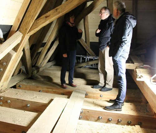 Die Bauschäden und die geplante Instandsetzungsmaßnahmen erläuterten Architekt Rolf Estelmann und Alexandra Ruffing vom Bischöflichen Bauamt in Speyer. Der Zahn der Zeit habe an der Kirche Heiligste Dreifaltigkeit deutliche Spuren hinterlassen. Am Mauerwerk zeigen sich vereinzelte Schäden am Außenputz. Die Dachflächen halten nicht mehr überall dicht und weisen konstruktive Mängel auf. Auch am Dachstuhl haben die Sachverständigen konstruktive und statische Mängel aufgrund fehlerhafter Knotenpunkte festgestellt. Hinzu kommt ein starker Anobienbefall durch Holzwürmer. Die Instandsetzung der Kirche umfasst die Dachstühle über Chor, Kirchenschiff und Turm, die Dachdeckung, die teilweise erneuert wird, sowie den Außenputz und den Außenanstrich. Die Arbeiten haben im Juli dieses Jahres begonnen und werden voraussichtlich im Frühjahr 2019 abgeschlossen.