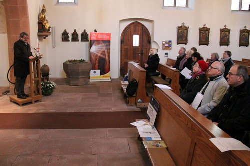 „Ein Kirchenbau in Dernbach wird erstmals im Jahr 1313 urkundlich erwähnt. Vermutlich handelt es sich hierbei um die Ende des 13. Jahrhunderts errichtete Jodocuskapelle“, erläuterte Wolfgang Franz, der Leiter des Bischöflichen Denkmalamts, die Geschichte des ersten Kirchenbaus, von dem heute noch der Chor mit Fragmenten einer Wandmalerei und figürliche Bauplastiken erhalten sind. Um das Jahr 1415 wurde die Jodocuskapelle zur Pfarrkirche erhoben. Zuvor waren Teile der Kirche abgerissen worden und das Langhaus, der Turm und die doppelgeschossige Sakristei wurden größer dimensioniert neu aufgebaut. 1634 stürzten die Gewölbe des Langhauses eine, an ihrer Stelle wurde eine Flachdecke eingezogen. Im Zuge der Einweihung des Neubaus wurde der Kirche das Patrozinium der Heiligsten Dreifaltigkeit verliehen. Seit dieser Zeit wurde die Kirche nicht mehr wesentlich verändert, größere Instandsetzungen erfolgten in der zweiten Hälfte des 19. Jahrhunderts und in der ersten Hälfte des 20. Jahrhunderts. „Die Kirche stellt mit ihrem relativ unbeschädigten Bestand an aufgehendem Mauerwerk aus den beiden Entstehungsphasen des 13. und des 17. Jahrhunderts, den darauf befindlichen Wandmalereien sowie dem großen Umfang bauzeitlicher Konstruktionshölzer in den Dachstühlen für die Region ‚Südliche Weinstraße‘ ein äußerst hochwertiges und rares Zeugnis der früh- und spätgotischen Sakralkunst dar“, würdigte Wolfgang Franz die denkmalpflegerische Bedeutung der Kirche. Aufgrund der erhöhten Lage und mit ihrem markanten Turm habe die Kirche landschaftsprägenden Charakter und sei für das Dernbacher Tal als „kleines Juwel“ anzusehen.