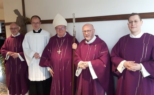 Das Bild zeigt (v. l): Spiritual Martin Seiter, Dr. Matthias Emanuel, Weihbischof Otto Georgens, Regens Markus Magin, Diakon Artur Noras
