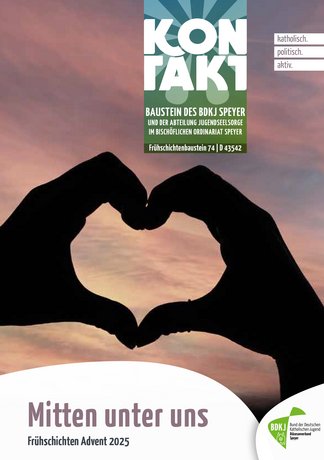Speyer. Mit „Mitten unter uns“ hat der Bund der Deutschen Katholischen Jugend (BDKJ) Speyer seine diesjährige Arbeitshilfe für Frühaufsteher-Gottesdienste in der Adventszeit überschrieben. Das Team hat unter diesem Motto vier Vorschläge für Impulse und Andachten erarbeitet. Die Frühschichten richten sich in erster Linie an Jugendgruppen in den Gemeinden des Bistums Speyer. Sie sind so aufbereitet, dass sie sich ohne großen Aufwand von Jugendlichen für Jugendliche umsetzen lassen. Die Bausteine eignen sich auch für spirituelle Momente in der Schule und können in verschiedene Gottesdienstformen in Pfarreien eingebunden werden.
