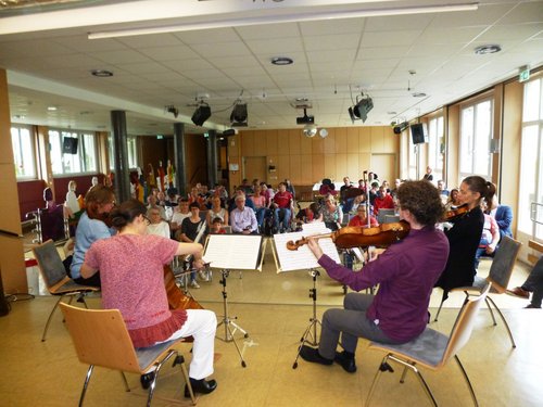 So gab es bei dem 16-jährigen Nils, der mit seinen Eltern zum Konzert gekommen war, kein Halten mehr. Voller Dynamik dirigierte er vom Rollstuhl aus mit und versuchte, die Musiker auf der Bühne anzufeuern. Von klein auf sei er ein musikalisches Kind gewesen, erzählt die Mutter, die sich über das „Classic mobil“- Angebot besonders freute. Denn ein Konzertbesuch an den üblichen Spielstätten sei nicht möglich, bedauerte sie. Auch ein Instrument könne Nils aufgrund seiner Motorik nicht erlernen, „aber das Singen in der Gruppe macht ihm sichtlich Spaß“, bestätigt auch der Vater. Nach letzten Mozarttönen hallen laute Begeisterungsrufe im Saal und gibt es viel verdienten Beifall für „Classic mobil“.