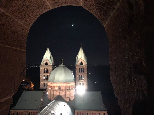 Speyer. Riesengroß war das Interesse an einem Besuch von Kaisersaal und Südwestturm während der Speyerer Kult(o)urnacht. Die beiden Bereiche im Westbau des Speyerer Doms waren erstmals teil des Programms. Von Beginn an bildete sich in der Vorhalle des Doms eine lange Schlange, die im Laufe des Abends immer länger werden sollte. Da sich aus Sicherheitsgründen maximal 50 Personen im Turm aufhalten dürfen, musste für den Blick auf das nächtliche Speyer eine Wartezeit von bis zu einer Stunde in Kauf genommen werden. Von Anfang bis Ende war der Turm maximal gefüllt, so dass von 19 – 24 Uhr 2520 Besucher gezählt werden konnten. Im Kaisersaal hörten die Menschen viertelstündlich einen Vortrag zu der Geschichte des Westbaus und der Domausmalung und bekamen Infos zu den dort ausgestellten monumentalen Fresken. „Wir freuen uns riesig über das immense Interesse an der Turmbesteigung während der Kult(o)rnacht,“ so Bastian Hoffmann, der Leiter des Dom-Besuchermanagements. „Es war toll, die Begeisterung der Menschen zu erleben. Unsere Besucher kamen mit viel guter Laune und verließen uns mit bleibenden Eindrücken. Kaisersaal und Südwestturm haben spürbar Erstaunen geweckt. Wir planen auf jeden Fall, im nächsten Jahr wieder dabei zu sein.“