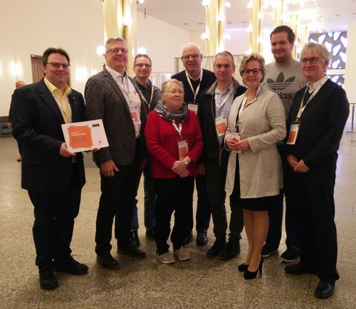 Die Delegation aus dem Bistum Speyer mit der neuen Bundesvorsitzenden (v.l.): Harald Reisel, Andreas W. Stellmann, Horst Stauder, Gisela Schroth, Walter Rung, Bernd Bastian-von Ruville, die neue Bundesvorsitzende des Kolpingwerkes Deutschland, Ursula Groden-Kranich MdB, Fabian Geib und Diözesanpräseas Michael Baldauf.