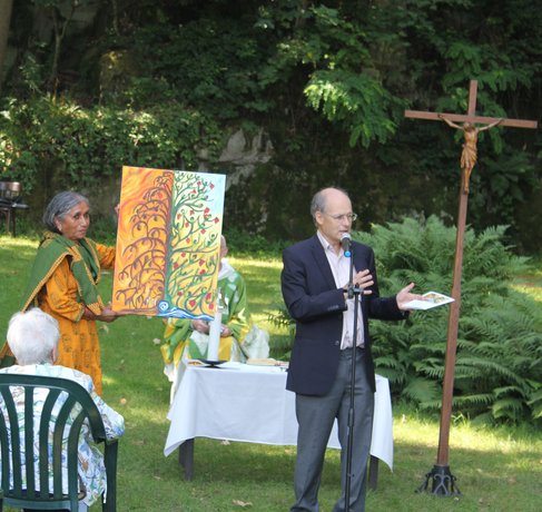 Bereits vor der offiziellen Eröffnung, im Sonntagsgottesdienst im Klosterpark, stellten Lucy D´Souza-Krone und ihr Mann Andreas Krone ausgewählte Bilder vor. Ihr Hauptanliegen ist, zu einer neuen Wertschätzung der Schöpfung beizutragen. „Mose weint“ heißt eines der Bilder, das schon vor mehreren Jahren entstanden ist und verletzte und abgeholzte Bäume zeigt, die der Auslöser sind für die Tränen Moses.