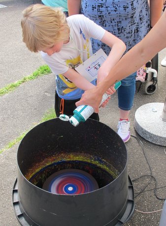 Über ein Dutzend Stationen auf den beiden Pausenhof-Arealen der Schule im Landauer Stadtteil Queichheim laden an diesem Fest-Donnerstag Mitte Juli dazu ein, spielerisch aktiv zu werden. Da ist Geschicklichkeit gefragt - etwa bei Jonglage-Übungen, beim Dosenwerfen oder bei dessen „Extrem-Variante“ mit gebläse-betriebener Tennisball-Schleuder. Die bedienen gerade Monique am Zielrohr und Angelina, die die Bälle nachlegt, mit sichtbarer Begeisterung. Und sie jubeln, als die letzte Dose gefallen ist. „Jaaa!“, antworten beide unisono auf die Frage, ob’s Spaß gemacht hat. Ebenfalls mit hörbarer Begeisterung üben sich am Stand nebenan Karaoke-Sänger. Und am Eingang zum Pausenhof lässt Maximilian hochkonzentriert an der Farbschleuder seine von der Rotation mitgestalteten Bilder entstehen.