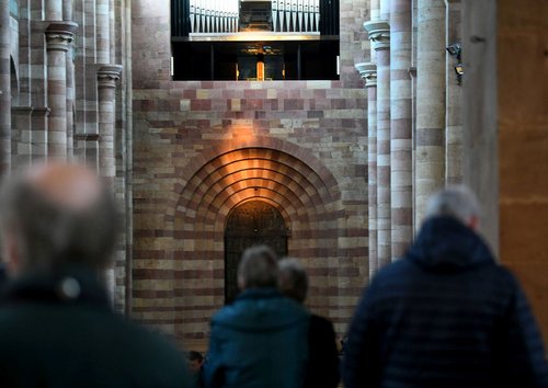 Speyer. Um 6.15 Uhr heute Morgen war der Dom bereits gut gefüllt. Viele Menschen waren der Einladung gefolgt, am Datum der Tag-und-Nacht-Gleiche den Sonnenaufgang im Innern der Kathedralkirche zu erleben. An diesem Tag scheint das Licht durch das kleine, runde Fenster in der Apsis und fällt durch das ganze Mittelschiff bis zum Hauptportal.