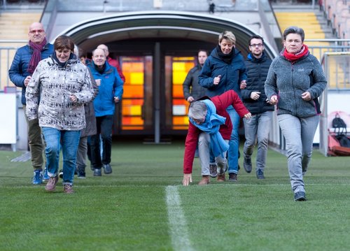 Diesem Experiment stellten sich neun ehrenamtliche Gottesdienstleiter und -leiterinnen des Bistums am letzten Novemberwochenende auf dem Betzenberg in Kaiserslautern. In der Arena des 1. FCK sollten sie unter Anleitung des Göttinger Regisseurs Bernward Konermann unterschiedliche Situationen eines Fußballspiels und die damit einhergehenden Gefühle als Gruppe darstellen. Eine Gottesdienst-Werkstatt der besonderen Art, die ein klares Ziel hatte. „Sich von der Stadion-Stimmung inspirieren zu lassen, um neue Ausdrucksformen für den Gottesdienst zu finden, die bei den Menschen Herz und Verstand ansprechen und sie begeistern. Gleichzeitig ging es darum, dass das Gottesdienstteam den gemeinschaftlichen Zusammenhalt wahrnimmt und sich entsprechend aufstellt“, erklärt Clemens Schirmer, Liturgiereferent des Bistums Speyer, Theaterpädagoge und Initiator des Workshops.
