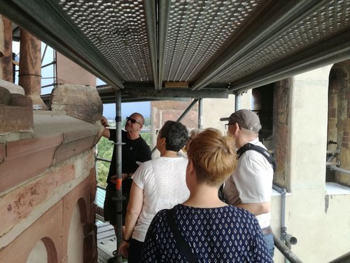 Speyer. Das Gerüst steht zum größten Teil – die Untersuchungen laufen und die nächste große Baumaßnahme wird bald beginnen: Der zuletzt in den 1960er Jahren sanierte Vierungsturm des Speyerer Domes steht erneut zur Sanierung an. An insgesamt drei Terminen gab es nun für rund 30 Mitglieder des Dombauvereins die exklusive Möglichkeit, unter Führung von Dombaumeister Mario Colletto die Baustelle in luftiger Höhe zu begehen und sich selbst ein Bild von den notwendigen Sanierungsmaßnahmen zu machen. Als „kleines Dankeschön“, so der Vorstandsvorsitzende des Dombauvereins, Dr. Gottfried Jung, der bei der zweiten Begehung mit dabei war. Mit ihrem Mitgliedsbeitrag unterstützen die Vereinsmitglieder die laufenden Restaurierungsmaßnahmen am Dom. Die Kosten für die Sanierung des Vierungsturms schätzt Dombaumeister Maria Colletto auf 700.000 Euro.