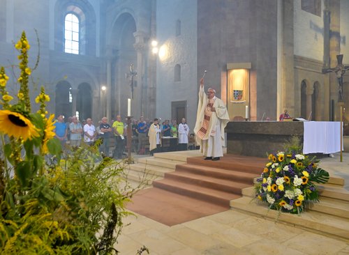Speyer. Angenehme 24 Grad hatte es im Innern des Domes, als am 15. August das Hochfest Mariä Himmelfahrt gefeiert wurde. Viele Menschen waren gekommen, darunter auch eine große Pilgergruppe, die das Patronatsfest des Speyerer Doms und des Bistums Speyer mitfeierten. Das von Bischof Dr. Karl-Heinz Wiesemann zelebrierte Pontifikalamt wurde live auf den Social-Media-Kanälen von Dom und Bistum übertragen, wo es auch im Nachgang angeschaut werden kann (https://www.youtube.com/watch?v=WkCZYY7Vaq0). Thematisch stellte Bischof Wiesemann den Gottesdienst unter das Motto „Pilger der Hoffnung“ und zeigte auf, wie das Bild der „mit Leib und Seele in den Himmel aufgenommenen Gottesmutter Maria“ allen Gläubigen ein Hoffnungszeichen sein könne. „Mit Maria dürfen wir das schauen, was uns im Glauben geschenkt wird“, sagte Bischof Wiesemann in seiner Begrüßung. Einen besonderen Gruß entbot er den Pilgern, die in einer nächtlichen Wallfahrt zum Dom gekommen waren sowie den mitfeiernden Gehörlosen, für die der Gottesdienst in Gebärdensprache gedolmetscht wurde.
