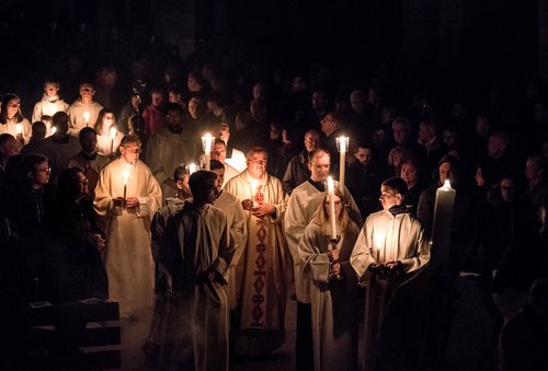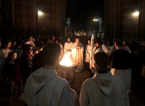 Speyer. Mit den Ostergottesdiensten feierten die Gläubigen im Bistum Speyer die Auferstehung Jesu Christi und damit das höchste Fest im Kirchenjahr. In der Osternacht wurde in der Vorhalle des Domes ebenso wie in vielen anderen Kirchen des Bistums das Osterfeuer entzündet. Mit der Osterkerze und dem Ruf „Lumen Christi“ wurde das Licht in die dunkle Kathedrale gebracht. Zum Gloria spielte die Orgel wieder und alle Glocken läuteten.