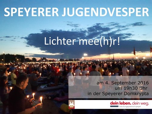 Speyer. Das Bistum Speyer lädt zur nächsten Jugendvesper in der Krypta des Speyerer Domes am Sonntag, den 4. September, um 19.30 Uhr ein. Unter dem Motto „Lichter mee(h)r!“ wird die Vesper an den Weltjugendtag in Krakau anknüpfen. „Er war für viele Jugendliche aus der ganzen Welt eine ganz besondere Erfahrung. Rund eineinhalb Millionen junge Erwachsene schweigen, beten, freuen sich gemeinsam und haben eine klare Botschaft für unsere Welt: Zieht keine Mauern gegeneinander hoch, sondern baut Brücken und sendet Licht und Frieden in diese Welt“, laden Pfarrer Ralf Feix und Pastoralreferentin Sandra Petrollo-Shahtout zur Teilnahme an der Jugendvesper ein.