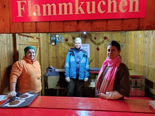 Ehrenamtliche Helfer:innen der Initiative „Lu can help“ engagieren sich auf dem Weihnachtsmarkt in Ludwigshafen-Oggersheim. Durch den Verkauf von Flammkuchen, Kaffee und Kuchen generieren sie Spenden für Hilfsprojekte.