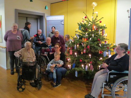 Auf das Engagement von Natalie Sebastian stiftete die Firma Hornbach einen Weihnachtsbaum, der von der Familie Sebastian am Samstag vor dem dritten Advent aufgestellt wurde. „Die Bewohner hatten alleine daran schon eine Riesen Freude“, berichtete Leiterin Regina Greiner. Am Montag wurde der Baum geschmückt und die Bewohner konnten ihre Wunschzettel in die Zweige hängen. In kurzer Zeit kamen rund 45 Wunschzettel zusammen. Die Wünsche waren sehr vielfältig wie zum Beispiel ein Spaziergang oder eine Spazierfahrt im Rollstuhl und eine gemeinsame „Mensch-ärgere dich nicht“-Spielrunde.