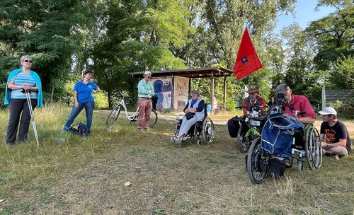 Bald hatte die Gruppe ein Gefühl, welches Tempo die anderen jeweils als angenehm empfanden. Schnell war auch klar, die Rolli-Fahrerinnen und -Fahrer konnten viel schneller als alle anderen, wenn sie wollten. Sie passten sich an die Schrittgeschwindigkeit an. Über den Tag hatte jede und jeder die Möglichkeit von den anderen zu erfahren, was sie im Leben machten, wo sie herkamen und wieso sie dabei waren.