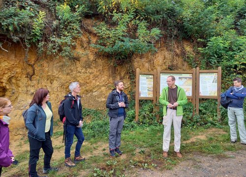 Auch die Geologie des Rheingrabens regte zu neuen Fragen an: Wo ist etwas aufgebrochen? Wo erkennen wir neue Bewegungen? Zwischen den einzelnen Stationen tauschten sich die Teilnehmer*innen zu den verschiedenen Fragen und Impulsen aus. Nur die letzte Wegstrecke zur Waldhütte wurde einzeln und in Stille begangen – dafür bot sich der enge Weg geradezu an. Dortgab es dann leckeres pfälzisches Essen und die intensiven Gespräche wurden weitergeführt.