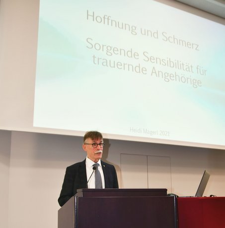 Heidi Magerl, Supervisorin, Dozentin Palliative Care und Hospizbegleiterin, führte den Teilnehmenden zunächst vor Augen, was Trauer eigentlich ist – und wo sie anfängt: „Trauer beginnt nicht erst mit dem Tod, sie beginnt schon mit der Diagnose einer unheilbaren Krankheit.“ Daher seien die Angehörigen von Sterbenden doppelt belastet – einmal durch die Sorge um und für die Sterbenden, zum anderen durch ihre Trauer. Denn schon während der Sterbebegleitung müssen die Angehörigen von Vielem Abschied nehmen. Dies führe zu einer großen Verletzlichkeit der Angehörigen. „Trauernde Angehörige befinden sich in einer existenziellen Lebenskrise, sind vulnerabel und somit ungeschützt vor Verletzungen. Sie brauchend deshalb von uns eine erhöhte Aufmerksamkeit im Umgang mit ihnen“, betonte Magerl.