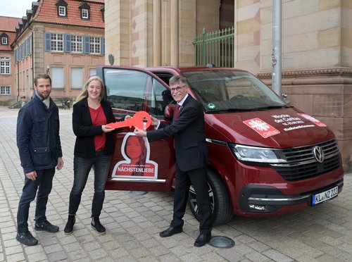 Domkapitular Karl-Ludwig Hundemer übergibt den symbolischen Bus-Schlüssel an Stefanie Horn-Wolniewcz und Lukas Buschbacher. Eine Woche lang werden die Referenten für Gemeindecaritas durch die Diözese fahren, um mit den Menschen ins Gespräch zu kommen.