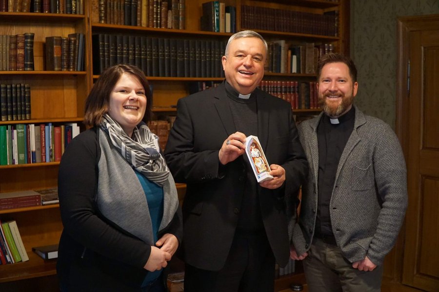 Übergabe eines Schoko-Nikolauses der Aktion "Vorfahrt für den Nikolaus": Lena Schmidt (BDKJ-Diözesanvorsitzende), Bischof Dr. Karl-Heinz Wiesemann und Pfarrer Carsten Leinhäuser (BDKJ-Diözesanvorsitzender) v.l.n.r.