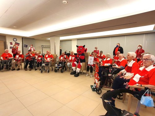 Landstuhl. Die Arme hoch. La Ola, die aus Stadien und Hallen bekannte Welle läuft. Aber nicht durch ein Stadion, sondern durch das Caritas-Altenzentrum St. Nikolaus in Landstuhl. Der hier im Sommer gegründete FCK-Fanclub „Luschdische alde Deiwel“ feiert sein sechsmonatiges Jubiläum. Mit Ehrengästen. Den größten Jubel löst ein großer, roter Ehrengast mit Teufelshörnern aus. „Hat der große Fies“, sind die Mitglieder des FCK-Fanclubs beeindruckt von der Schuhgröße, die Betzi trägt. Die 60 wird dabei überschritten. Das Maskottchen des Fußball-Zweitligisten hat es sich nicht nehmen lassen, bei der Feierstunde im Seniorenzentrum dabei zu sein.