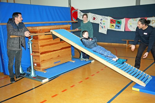 Der elfjährige Philip Weismann aus Landau besucht bislang eine Schule mit dem Förderschwerpunkt Sehen im baden-württembergischen Ilvesheim bei Mannheim. Mit seinem Vater Frederik ist er zum „Tag des offenen Klassenzimmers“ in die Schule des Caritas-Förderzentrums in Queichheim gekommen. Er möchte erfahren, ob es ihm auch hier gefallen würde und was die Einrichtung für seine Bedürfnisse bieten kann. Die beiden schließen sich zunächst einer Gruppe an, die Dimitrius Kitsikoudis, Physiotherapeut im Einrichtungsteam, durch die Schule führt. Sie sehen etwa die Turnhalle, die neue Kletterwand, das Schwimmbad, den Snoezelraum und die Therapiezimmer. Während Philip mit sichtbarem Spaß zum Beispiel die Rollenrutsche in der Turnhalle und die Kletterwand ausprobiert, stellt sein Vater dem Physiotherapeuten eine Reihe von Fragen. Die Hilfsmittelversorgung ist da ebenso Thema wie therapeutische Maßnahmen neben dem Unterricht. Frederik Weismann erfährt, dass über das ebenfalls am Standort Queichheim bestehende und zum dortigen Frühförderzentrum gehörende Sozialpädriatrische Zentrum (SPZ) die notwendigen ärztlichen Untersuchungen und Verordnungen direkt vor Ort möglich sind. Auch Logo-, Ergo- und Physiotherapie können hier durchgeführt werden. Außerdem, erklärt Kitsikoudis den Rundgangsteilnehmern, wird auch der Unterricht an der Schule selbst ganz auf den Förderbedarf, die Fähigkeiten und Kompetenzen der Schülerinnen und Schüler abgestimmt.