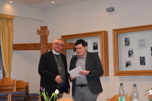 Ein gemeinsames Abendessen im Edith-Stein-Haus beschloss den Tag, bei dem man „zusammensitzen und sich austauschen konnte, was auch für Theologen immer wieder wichtig ist“, wie Bischof Wiesemann betonte. Bei dieser Gelegenheit erhielt der Weihekandidat aus der Hand des Bischofs seine Admissio-Urkunde. Gabriel Kimmle bedankte sich beim Bischof für das in ihn gesetzte Vertrauen und die Zusage des Gebetes. Bischof Wiesemann bedankte sich bei der Pfarrei für die gastfreundliche Aufnahme und wünschte allen fruchtbare Kar- und Ostertage.