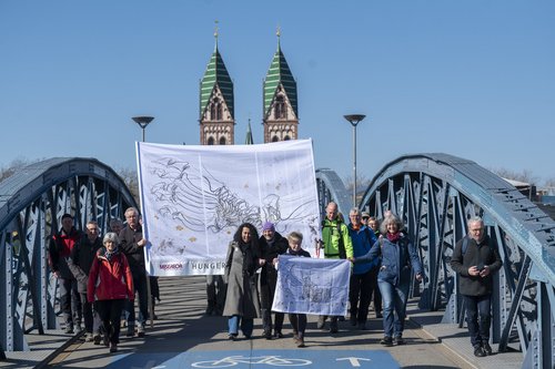2022 wurde das Hungertuch "Du stellst meine Füße auf weiten Raum - Die Kraft des Wandels" von Lilian Moreno Sánchez von Hildesheim nach Freiburg im Breisgau getragen. © Misereor