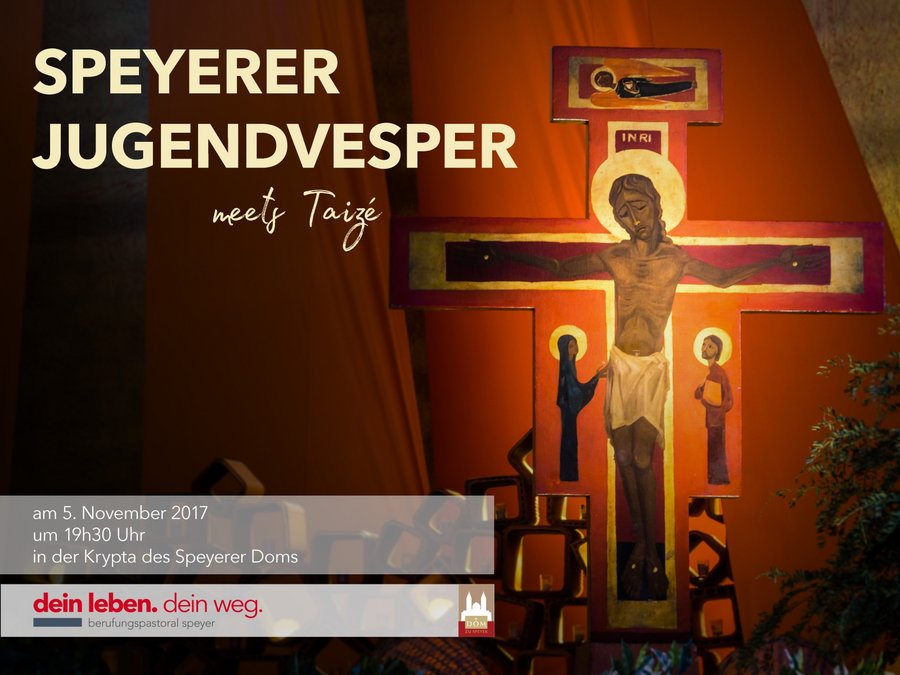 Speyer. Die Stelle „Berufungspastoral Speyer“ im Bistum Speyer lädt zur nächsten Jugendvesper in der Krypta des Speyerer Domes am Sonntag, den 5. November, um 19.30 Uhr ein. Unter dem Motto "Jugendvesper ...meets Taizé!" wird an die Erlebnisse einer Gruppe von knapp 50 Jugendlichen aus dem Bistum Speyer, die in den Herbstferien in Taizé waren, angeknüpft. Der Vesper steht Diözesanjugendseelsorger Carsten Leinhäuser vor. Als erfahrener Taizépilger wird er auch die Predigt halten.