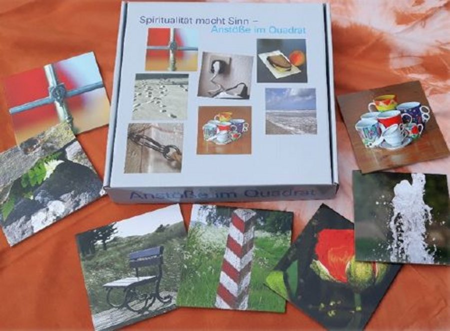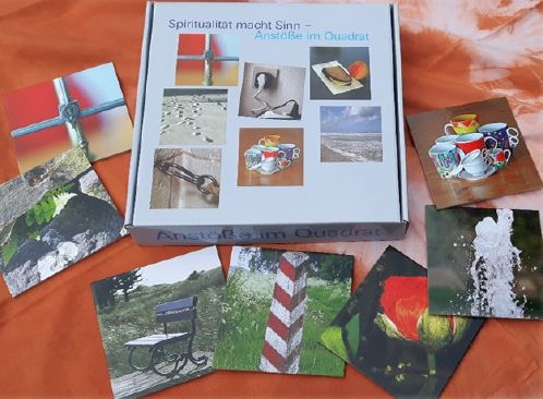 Die Bild-Wort-Karten sind Materialien aus „Spiritualität macht Sinn – Anstöße im Quadrat“: Eine Kassette mit den 40 Bild-Karten, einem Begleitheft und einer CD, die von Verantwortlichen für die Seniorenarbeit in den Diözesen Freiburg, Limburg und Speyer entwickelt wurde. Auf der Rückseite der Bild-Karten steht jeweils ein erfahrungsbezogener Begriff, von „Achtsamkeit“, „Angst“, „Beten“ bis zu „Wurzeln“, „Wut“, „Zärtlichkeit“. Vor- und Rückseite stehen nicht in strengem Zusammenhang – auch das gibt Gesprächsstoff. Denn es lassen sich gut andere Bilder zu den Begriffen und andere Begriffe zu den Bildern vorstellen.