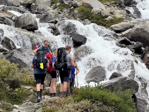 Der Aufstieg am ersten Tag aus dem Virgental hat es gleich in sich: vom Parkplatz in Ströden sind es rund 800 Höhenmeter hinauf zur Essener-Rostocker Hütte. Ein erster Test, ob die Schuhe gut passen und die Kondition stimmt. Die Anstrengung lohnt sich, denn schnell tauchen wir in die beeindruckende Berglandschaft Osttirols ein und folgen dem rauschenden Maurerbach – einem von zahllosen Gletscherbächen, die wir auf unserer Tour immer wieder überqueren und bestaunen. In den folgenden Tagen erleben wir viele beglückende Momente: der Blick auf die verschneiten Gipfel in der Morgensonne; Murmeltiere, die auf dem warmen Felsen „Wache halten“; der türkisblaue Eissee, in dem sich die Berge spiegeln (einige Unerschrockene nehmen sogar ein eisiges Bad); die letzten Edelweis des Bergsommers; die Stärkung am Abend in den gastfreundlichen Alpenhütten. Und immer wieder und allgegenwärtig das prägende Element: Wasser! „Gelobt seist du, mein Herr, für Schwester Wasser. Sehr nützlich ist sie und demütig und kostbar und keusch.“ Diese Strophe aus dem Sonnengesang des Heiligen Franziskus, den wir täglich gemeinsam beten, wird ganz anschaulich: In Gebirgsseen und in kleinen und großen Wasserfällen entlang unserer Route, gefroren im Gletschereis und als satter Tau auf den Gräsern am Morgen – und, da hatten wir Wetterglück, selten auch mal als Regen von oben.