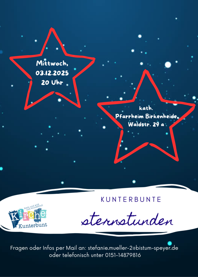 Birkenheide. „Kunterbunte Sternstunden“ ist der Titel des nächsten Abends für Erwachsene bei der „Kirche Kunterbunt Maxdorf +“. Er findet am Mittwoch, 03.12.2025, um 20.00 Uhr im katholischen Pfarrheim Birkenheide (Waldstr. 29a) statt.