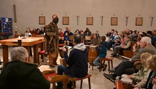 Diese außergewöhnliche Feier fand am vierten Adventssonntag in der Kirche St. Hildegard in Ludwigshafen (Pfarrei Hl. Katharina von Siena) statt, in der Abbé Bernard gerade ein Sabbat-Jahr verbringt. Überraschend viele Menschen aus der Pfarrei und Umgebung waren neugierig, wie das denn gelingen sollte. Wir sind ja nun besinnliche Lieder gewohnt, womöglich begleitet von zarten Flöten oder Geigen – aber Adventslieder mit Trommeln und afrikanische Rhythmen?