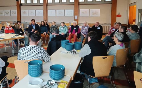 Austausch in großer Runde: Sozialdezernent David Guthier (4. v. li.) spricht mit den Ehren- und Hauptamtlichen der Winterhilfe, Foto: Dr. Anette Konrad