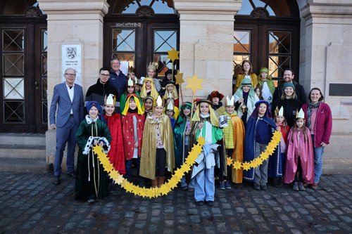Gemeinsam mit Oberbürgermeister Dominik Geißler und Dekan Axel Brecht brachten die Kinder und Jugendlichen den traditionellen Sternsinger*innensegen Christus mansionem benedicat an der Eingangstür des Rathauses an und überbrachten ihre Botschaft von Frieden, Solidarität und Gerechtigkeit.