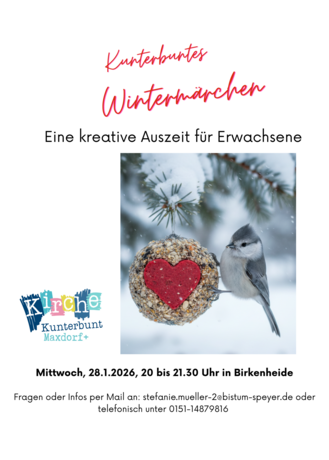 Birkenheide. Mitten im kalten Januar tut ein gemütlicher Abend mit netten Menschen und kreativem Tun gut. Das bietet die nächste Veranstaltung für Erwachsene bei der „Kirche Kunterbunt Maxdorf +“. Sie steht unter dem Motto „Kunterbunte Wintermärchen“ und findet am Mittwoch, 28.01.2026, um 20.00 Uhr im katholischen Pfarrheim Birkenheide (Waldstr. 29a) statt.