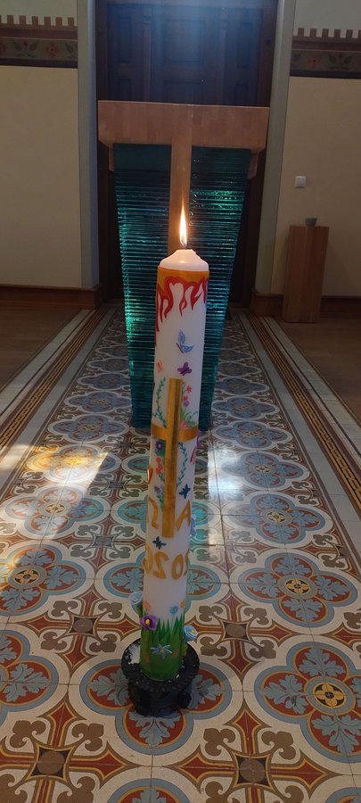 Landau. Wie jedes Jahr wurde auch die diesjährige Osterkerze von den Schülerinnen der Maria-Ward-Schule gestaltet. Zum ersten Mal wurde hierbei ein dreidimensionaler Ansatz gewählt. So fallen direkt die kunstvoll gestalteten Blumen und auch die Schmetterlinge auf, die aus der Osterkerze herausragen. Inhaltlich möchten die Schülerinnen mit ihrem Motiven die Osterbotschaft als einen „Wandel“ transportieren: Die Schmetterlinge, welche durch die Metamorphose aus Raupen erwachsen, die Blume, welche aus unscheinbaren Körnern wächst, Feuer und Wasser als Symbole des Wandels und der Taufe als Neubeginn.