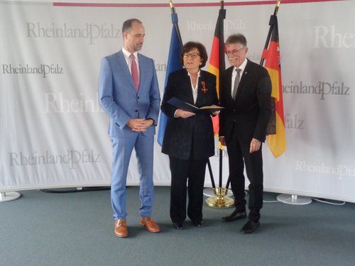 Die Stiftungsvorsitzende Marlies Kohnle-Gros bei der Ehrung. Ebenso zu sehen: Clemens Hoch, Minister für Wissenschaft und Gesundheit (links) und Karl Ludwig Hundemer, ehemaliger Vorsitzender des Diözesancaritasverbandes für das Bistum Speyer (rechts).