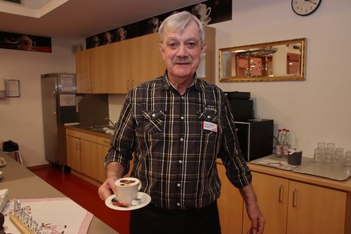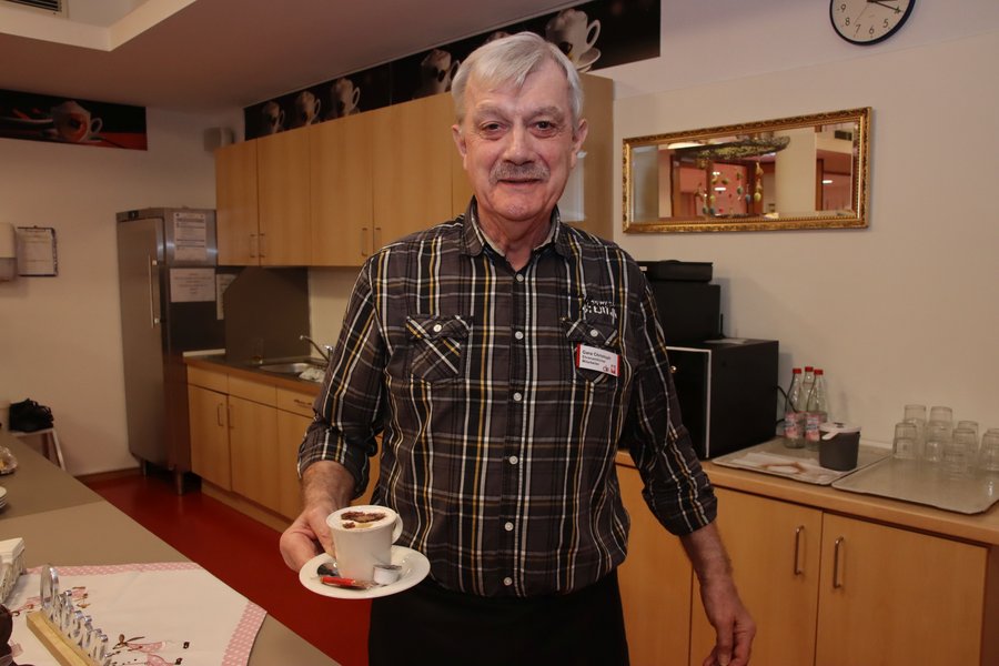Neben Stefanie Kellerhals steht Christoph Ganz an der Kaffeemaschine und bereitet einen Cappuccino zu. Am Ende zaubert er mit einer Schablone noch ein Herz in den Milchschaum. Er ist durch Manuela Werner, die Ehrenamtskoordinatorin des Altenzentrums, in die Einrichtung gekommen. Erst hat er im Garten geholfen, dann ist jemand in der Cafeteria ausgefallen und Christoph Ganz hat probeweise ausgeholfen. Inzwischen ist er dienstags und jeden ersten Sonntag im Monat im Einsatz. „Das macht viel Spaß, ich würde es nicht mehr missen wollen“, sagt er jetzt. „Das sind zwei Herzen mit Füßen“, sagt Manuela Werner, und blickt auf Stefanie Kellerhals und Christoph Ganz. Es sei so schön zu sehen, mit welcher Begeisterung die beiden bei der Arbeit sind und welche Freude sie damit den Bewohnern und Besuchern machen.